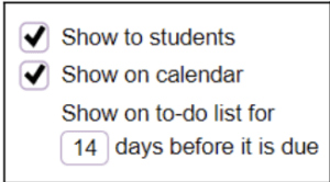 - Make sure “Show to student,” “Show on calendar,” and “Show on to-do list for 14 days before it is due” as seen here: