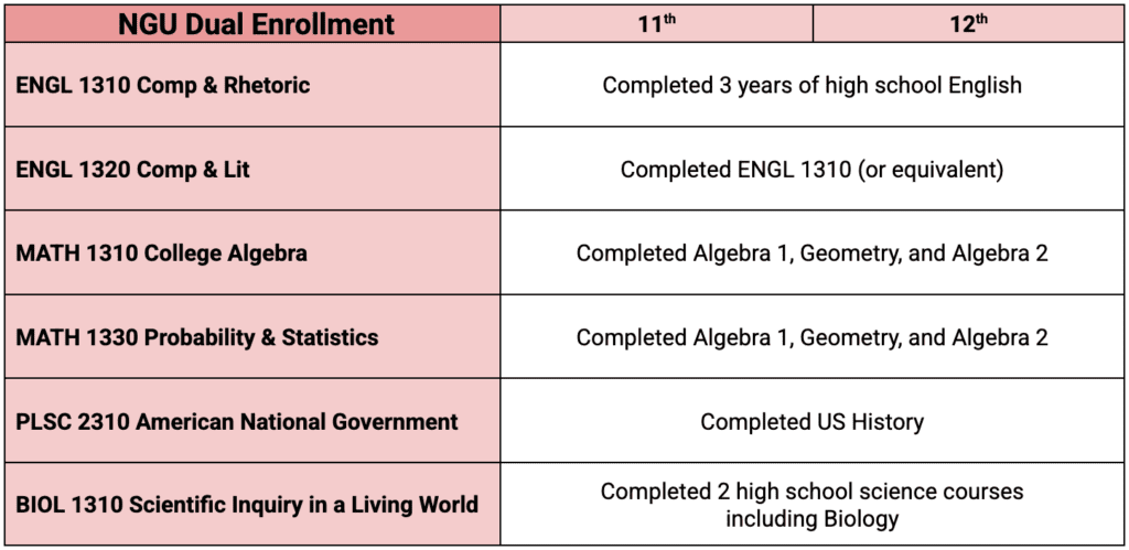 Before enrolling in an NGU dual enrollment course at UHC, please review our grade level and prerequisites chart below.